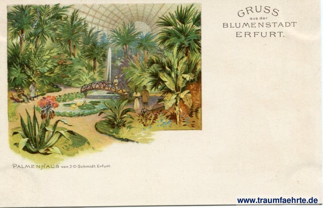 – Details – Jahr: ca. 1900 Status: ungelaufen Beschriftung vorne: Gruss aus der Blumenstadt Erfurt. Palmenhaus von J. C-Schmidt, Erfurt. Beschriftung hinten: Deutsche Reichspost, Postkarte. An ... in ... Zum Aufkleben der Marke. Stempel: keine Hinweis: