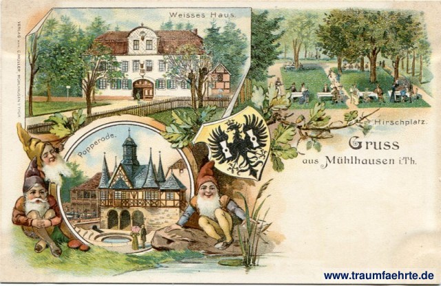 – Details – Year: ca. 1900 Postal state: postally unused Inscription front: Gruss aus Mühlhausen i. Th. Weisses Haus. Hirschplatz. Popperode. Verlag von C. Müller, Mühlhausen i./ Thür. Inscription back: Deutsche Reichspost, Postkarte. An ... in ... Zum Aufkleben der Marke. Postmark(s): none Please note: