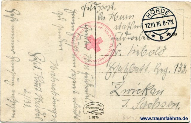 – Details – Jahr: ca. 1915 Status: gelaufen ohne Briefmarke (Feldpost), 1916 Beschriftung vorne: Hörde. St. Josephshospital Beschriftung hinten: Hermann Lorch, Kunstanstalt, Dortmund, L 8176, 26089 Stempel: Hörde, * b *, 12.10.16. 6-7N. Vereinslazarett Hoerde-Stadt St. Josephs-Hospital Hinweis: