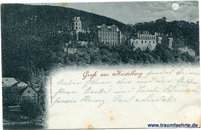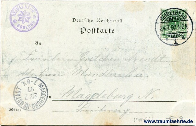 – Details – Year: ca. 1895 Postal state: postally used 1897 Inscription front: Gruß aus Heidelberg, Römmler & Jonas, Dresden. Inscription back: Deutsche Reichspost, Postkarte, An ... in ... 1050 bn g Postmark(s): Heidelberg, * 1 a, 24.7.97.1-2N; Magdeburg-Neustadt, 25/7 97 7-8V.; Heidelberg, Schloss Please note: