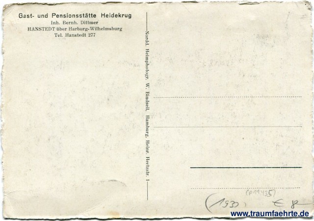 – Details – Jahr: ca. 1930 Status: ungelaufen Beschriftung vorne: Gast- u. Pensionsstätte Heidekrug Hanstedt. Beschriftung hinten: Gast- und Pensionsstätte Heidekrug, Inh. Bernh. Dittmer, Hanstedt über Harbug-Wilhelmsburg, Tel. Hanstedt 277, Nordd. Heimphotogr. W. Bindseil, Hamburg, Heinr. Hertzstr. 1 Stempel: keine Hinweis: