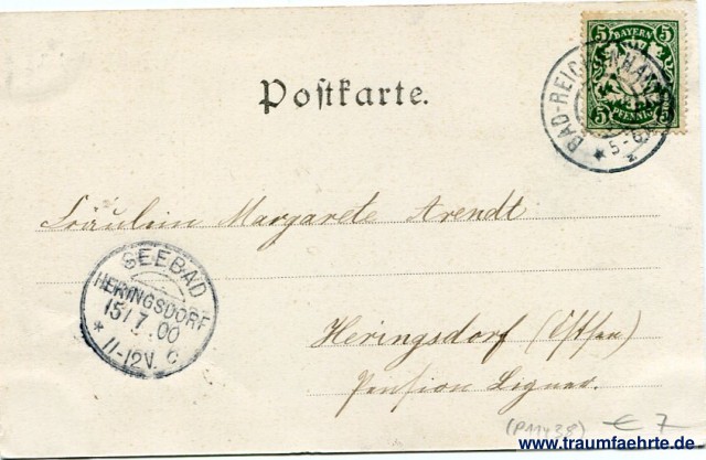 – Details – Year: ca. 1895 Postal state: postally used 1900 Inscription front: Bad Reichenhall. Stengel & Co., Dresden. 1352. Inscription back: Postkarte. Postmark(s): Bad Reichenhall, 13. Jul 00, 5-6[N]; Seebad Heringsdorf, c, 15 7 00, 11-12V. Please note: