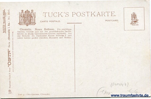 – Details – Jahr: ca. 1910 Status: ungelaufen Beschriftung vorne: Chemnitz, Neues Rathaus, [N. Beraud] Beschriftung hinten: Tuck's Postkarte. Carte postale. Postcard. Chemnitz. Neues Rathaus. Ein prächtiger Neubau, welcher sich mit der anschließenden Jacobi-Kirche zu einem harmonischem Ganzen verbindet. Auf der Südseite die Denkmäler Kaiser Wilhelm I. und seiner beiden großen Paladine, Bismarck und Moltke. Weite-Weite-Welt Serien, Raphael Tuck & Sons Oilette Serie Chemnitz i. Sa. No. 2017. Hoflieferanten S. Majestät des Kaisers udn Königs. Verlag: Otto Gassner, Chemnitz. R&S T, R&S T, Trade Mark Stempel: keine Hinweis: