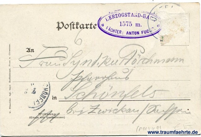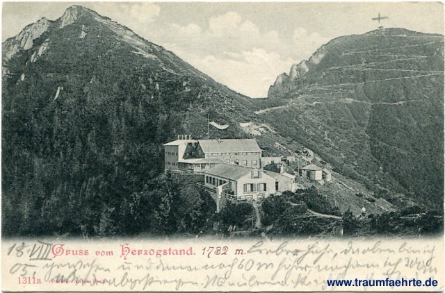 – Details – Year: ca. 1900 Postal state: postally used, stamp removed Inscription front: Gruss vom Herzogstand. 1732 m. 1311a Pächter Anton Fuchs Inscription back: Postkarte, An ... in ... Wohnung (Straße und Hausnummer) ... O. Blaschke. Kgl. Bayr. Hoflieferant, Prien a. Chiemsee. Postmark(s): [U...] [...]; Herzogsstand-Haus, 1575 m. Pächter: Anton Fuchs; [Schönefeld], [...] Please note:
