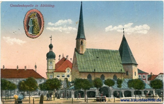– Details – Jahr: ca. 1925 Status: gelaufen 1930 Beschriftung vorne: Gnadenkapelle in Altötting. Beschriftung hinten: Franz Josef Huber's Postkartenhaus, München. 32309 Stempel: Altötting, * * b, [...].9.30 16-17 Hinweis: