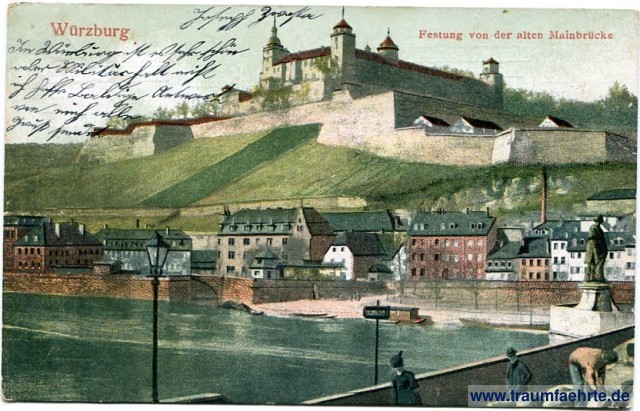 Beschriftung vorne: Würzburg, Festung von der alten Marienbrücke