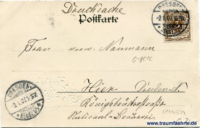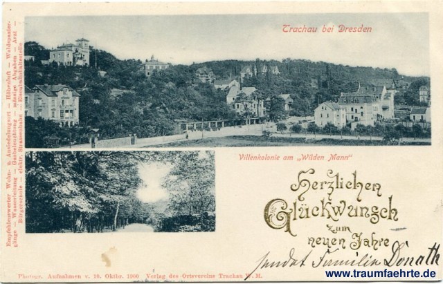– Details – Year: 1900 Postal state: postally used 1901 Inscription front: Herzlichen Glückwunsch zum neuen Jahre, Trauchau bei Dresden, Villenkolonie am Wilden Mann, Photogr. Aufnahmen v. 10. Oktbr. 1900, Verlag des Ortsvereins Trachau W. M. Empfehlenswerter Wohn- u. Ansiedlungsort – Höhenluft – Waldspaziergänge – Wasserleitung – Gasbeleuchtung – mässige Abgaben – Arzt – Bürgerschule – elektr. Strassenbahn – Eisenbahnhaltestelle Inscription back: Postkarte Postmark(s): Dresden-Neust. 22, a, -2.1.01.10-11N; Dresden-Neust. [1...], -3.1.01.07.[5-6V] Please note:
