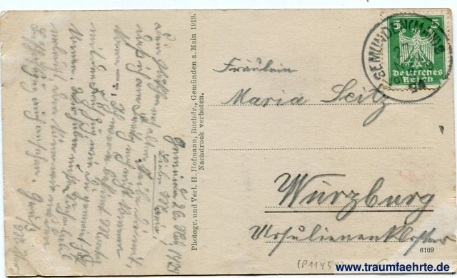 – Details – Jahr: 1919 Status: gelaufen 1928 Beschriftung vorne: Gemünden a. Main Beschriftung hinten: Photogr. und Verl. H. Hofmann, Buchdr., Gemünden a. Main 1919. Nachdruck verboten. 6109 Stempel: Gemünden (Main) 2, 27 Nov [28] Vor 8 – 9 Hinweis: