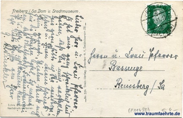– Details – Jahr: ca. 1930 Status: gelaufen 1931 Beschriftung vorne: Freiberg i. Sa. Dom u. Stadtmuseum. 334. Beschriftung hinten: Freiberg i. Sa. Dom u. Stadtmuseum. Echte Photographie. Nachdruck verboten. – No. 334 Stein-Verlag, Dresden-A. 1, Seidnitzerstr. 26 - Stempel: Freiberg (Sachsen), c, 14.10.31. 12-13 Hinweis: