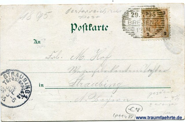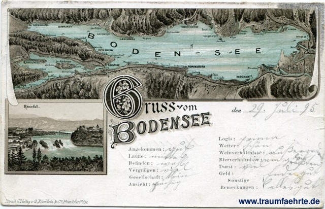 – Details – Jahr: ca. 1890 Status: gelaufen 1895 Beschriftung vorne: Gruss vom Bodensee, den ... . ..., Boden-See, Ludwigshafen, Ueberlingen, Seefelden, Unt .Uhldingen, Meeresburg, Hagnau, Immenstaad, Friedrichshafen, Eriskirch, Langenargen, Montfort, Argen, Schnaidt, Thunau, Wasserburg, Bad Schachen, Lindau, Bregenz, Hard, Fussach, Gaissau, Rhein Fl., Altenrhein, Rorschach, Steinach, Arbon, Luxburg, Romanshorn, Holzenstein, Kesswyl, Ruderbaum, Münstetlingen, Constanz, Ermatingen, Berlingen, Gaienhofen, Mammern, Eschenz, Burg, Horn, Gundholzen, Iznang, Radolphzell, Kaltbrunn, Ins. Reichenau, Oberzelt, Staad, Allmannsdorf, Egg, Matnau, Katharina, Dingelsdorf, Bodmann, Stockbach Fl., Pfändler Berg, Rheinfall. Druck u. Verlag v. G. Blümlein & Co., Frankfurt a./M. Angekommen:, Laune:, Befinden:, Vergnügen:, Gesellschaft:., Ansicht:, Logis:, Wetter:, Weinverhältnisse:, Bierverhältnisse:, Durst:, Geld:, Sonstige Bemerkungen: Beschriftung hinten: Postkarte. An ... in ... Stempel: Bregenz, 29. 7.95, 1 [...] N; Straubing 1. Theresienplatz, 30 Jul 95, Vor 5-6 Hinweis: