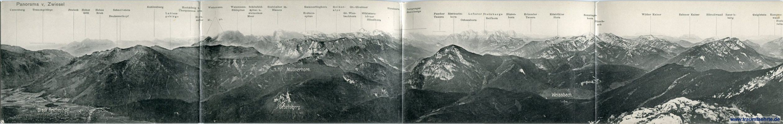 – Details – Year: ca. 1920 Postal state: postally unused Inscription front: Panorama v. Zwiesel, Stadt Reichenhall. Müllnerhorn. Gebersberg, Weissbach. Zwiesel. Untersberg, Tennengebirge, Freieck, Hoher Göll, Hohes Brett, Dreisesselkopf, Schneibstein, Kahlersberg, Lattengebirge, Hochkönig u. Übergossene Alm, Hochseiler, Watzmann, kl., gr., Watzmann-Südspitze, Schönfeldspitze u. steinernes Meer, Hochkalter m. Blaueis, Hocheisspitze, Kammerlinghorn, Reiteralpe, Gr. Wiesbachhorn, Gr.-Glockner, Mühlsturzhörner, Häuslhorn, Birnhorn, Leoganger Steinberge, Fuscher Tauern, Ristfeuchthorn, Ochsenhorn, Loferer Steinberge, Reifhorn, Hinterhorn, Krimmler Tauern, Kitzbühler Horn, Sonntagshorn, Hirscheck, Wilder Kaiser, Zahmer Kaiser, Hörndlwand, Rauschberg, Gaiglstein, Kampenwand, Hochfelln Inscription back: Verlag v. H. Gutjahr, Photogr., Freilassing, 10 59497 Postmark(s): none Please note:
