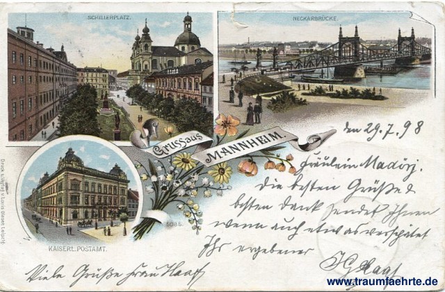 – Details – Jahr: ca. 1895 Status: gelaufen 1898 Beschriftung vorne: Gruss aus Mannheim. Schillerplatz. Neckarbrücke. Kaiserl. Postamt. 5085. Druck u. Verlag v. Louis Glaser, Leipzig. Beschriftung hinten: Deutsche Reichspost, Postkarte, An ... in ... Wohnung (Straße und Hausnummer) Stempel: Mannheim, * [2 ...], 29.7.98. 8-9N; Basel, Brf. Distr., 20.VII.98.VII Hinweis: