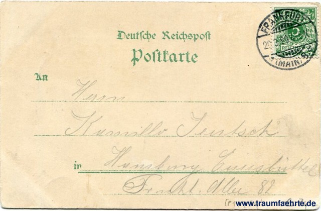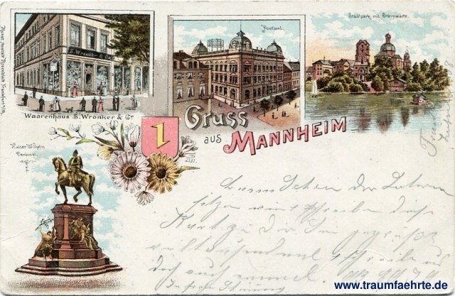 – Details – Jahr: ca. 1895 Status: gelaufen 1899 Beschriftung vorne: Gruss aus Mannheim, Waarenhaus S. Wronker & Co, Postamt. Stadtpark mit Sternwarte. Kaiser Wilhelm Denkmal. Kunst Anstalt Rosenblatt Frankfurt a/M. Beschriftung hinten: Deutsche Reichs[post], Postkarte, An ... in ... Stempel: Frankfurt (Main), 8, d, 20.3.99.4-5N Hinweis: