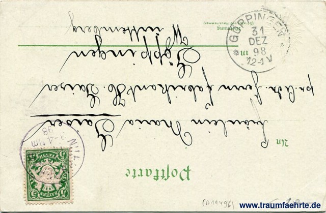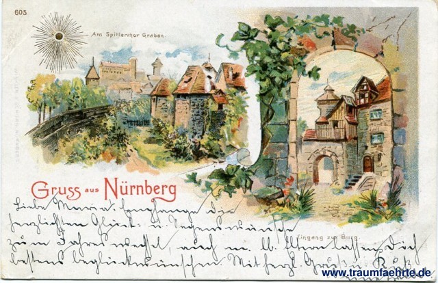 – Details – Jahr: ca. 1895 Status: gelaufen 1898 Beschriftung vorne: Gruss aus Nürnberg, Am Spitlerthor Graben. Eingang zur Burg. 605, Winkler & Schorn, Nürnberg Beschriftung hinten: Postkarte, An ... in ... Wohnung (Straße und Hausnummer) ... Stempel: Nuernberg, 30 Dez 98, 3-4 Nm; Göppingen, 31 Dez 98, 12-1 V Hinweis:
