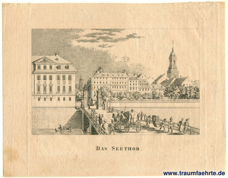 Original: Holzstich – Rekonstruktion des Seetors (Brücke über den Stadtgraben) mit Kutsche, Passanten, Statuen und Boot; Altstadt mit Hofkirche und Kreuzkirche im Hintergrund
