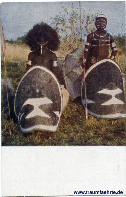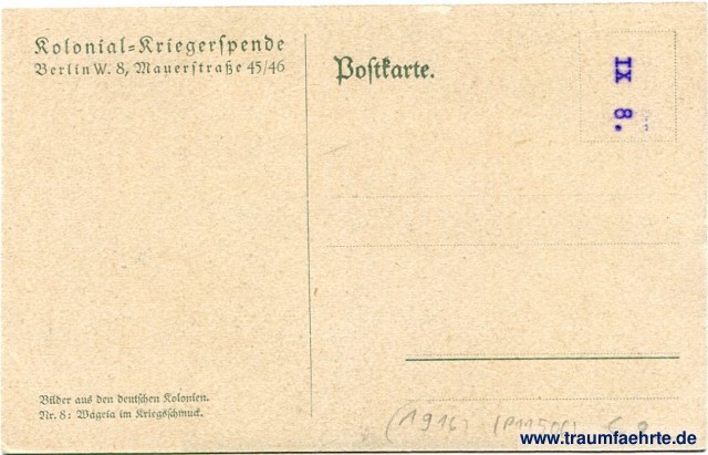 – Details – Jahr: 1916 Status: ungelaufen Beschriftung vorne: kein Text Beschriftung hinten: Postkarte. Kolonial-Kriegerspende, Berlin W. 8, Mauerstraße 45/46, Bilder aus den deutschen Kolonien, Nr. 8: Wageia im Kriegsschmuck. Stempel: IX 8. Hinweis: