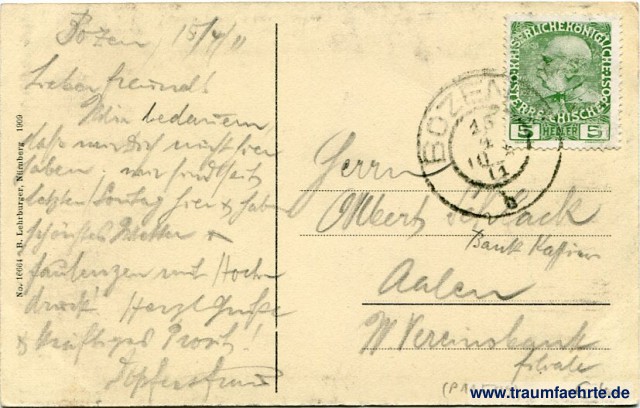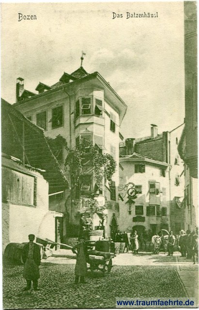 – Details – Jahr: 1909 Status: gelaufen 1911 Beschriftung vorne: Bozen, Das Batzenhäusl, Bat[zenhä]usel Beschriftung hinten: No. 16664 B. Lehrburger, Nürnberg, 1909 Stempel: Bozen, b, 15 4 11, 10 [...] Hinweis: