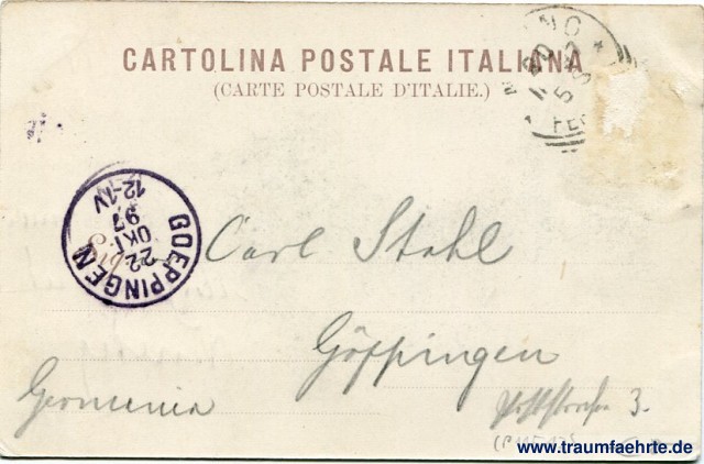 – Details – Jahr: ca. 1895 Status: gelaufen 1897, Briefmarke entfernt Beschriftung vorne: Saluti da Milano. Panorama. 212 Beschriftung hinten: Cartolina Postale Italiana (Carte Postale D'Italie.) Stempel: [Milano] [...]; Goeppingen, 22 Okt 97 12-1V Hinweis: