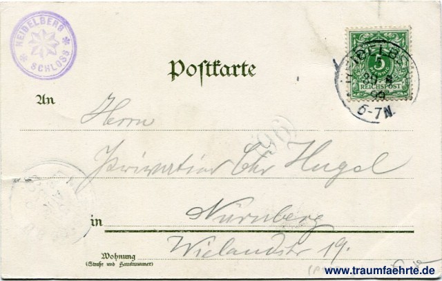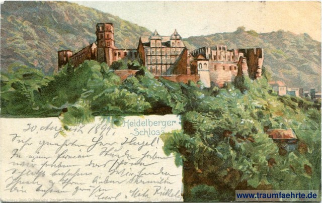 – Details – Year: ca. 1895 Postal state: postally used 1899 Inscription front: Heidelberger Schloss, Verlag u. Druck Dr. Haas'sche Druckerei Mannheim Inscription back: Postkarte, An ... in ... Wohnung (Straße und Hausnummer) ... Postmark(s): Heidelberg, 30 8 99, 6-7N; [...] 31 Aug [...] Vor 5-6; Heidelberger Schloss; (96) Please note:
