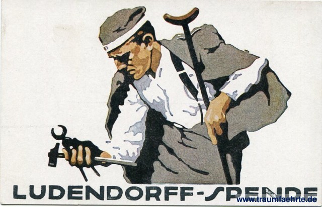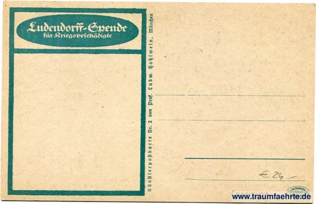– Details – Jahr: 1918 Status: ungelaufen Beschriftung vorne: Ludendorff-Spende Beschriftung hinten: Ludendorff-Spende für Kriegsbeschädigte, Künstlerpostkarte Nr. 2 von Prof. Ludw. Hohlwein, München, Graph. Kunstanstalt F. Bruckmann A-G. * München * Stempel: keine Hinweis: