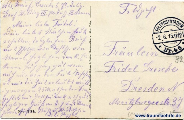 – Details – Jahr: ca. 1915 Status: gelaufen ohne Briefmarke (Feldpost), 1915 Beschriftung vorne: Bétheniville. Beschriftung hinten: Nr. 331. Kunst- u. Verlagsanstalt Schaar & Dathe, Komm.-Ges. a. Akt., Trier. Stempel: Feldpoststation, * Nr. 46 *, -2 6. 15.11-12 V Hinweis: