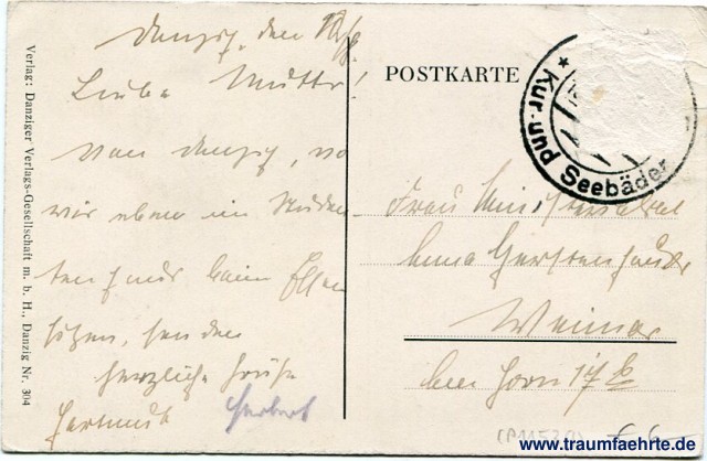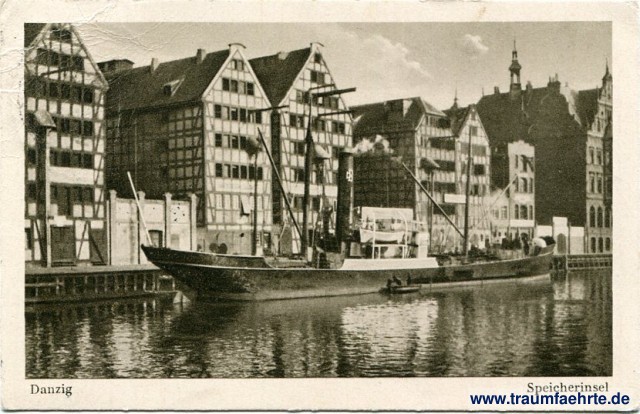 – Details – Jahr: ca. 1940 Status: gelaufen, Briefmarke entfernt Beschriftung vorne: Danzig, Speicherinsel Beschriftung hinten: Postkarte, Verlag: Danziger Verlags-Gesellschaft m. b. H., Danzig Nr. 304 Stempel: [...] Kur- und Seebäder [...] Hinweis: