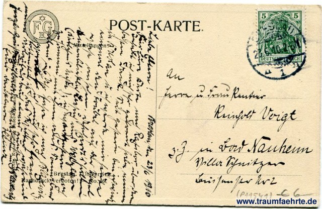 – Details – Jahr: ca. 1905 Status: gelaufen 1910 Beschriftung vorne: kein Text Beschriftung hinten: Post-Karte. Mitteilungen: Breslau. Universität. Nachdruck verboten! No. 65, F G B. Original-Aufn. Kunstverlag Fedor Grünthal, Uhlandstr. 136 Berlin-Wilmersdorf Stempel: Breslau, [h] 1 [h], 23.6.10. 2-3N. Hinweis: