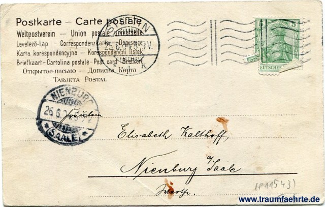 – Details – Jahr: ca. 1900 Status: gelaufen 1904 Beschriftung vorne: W. Schwar. Beschriftung hinten: Postkarte – Carte Postale, Weltpostverein – Union postale universelle, Levelezö-Lap – Correspondenzkarte – Dopisnice, Karta korespondencyjna – Korespondencni listek, Briefkaart – Cartolina postale – Post card – Brefkort, Открытое письмо. Дописна карта, Tarjeta postal Stempel: Stettin, * 1 k, 25.6.04.8-9V.; Nienburg (Saale), 26.6.04 6-7V. Hinweis: