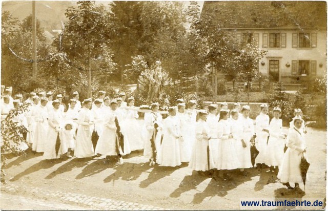 sepiafarbene Schwarzweißfotografie – Festumzug: Frauen und Mädchen in weißen Kleidern, mit Kranzschmuck aus Blumen und Regenschirmen, Statue und Haus im Hintergrund