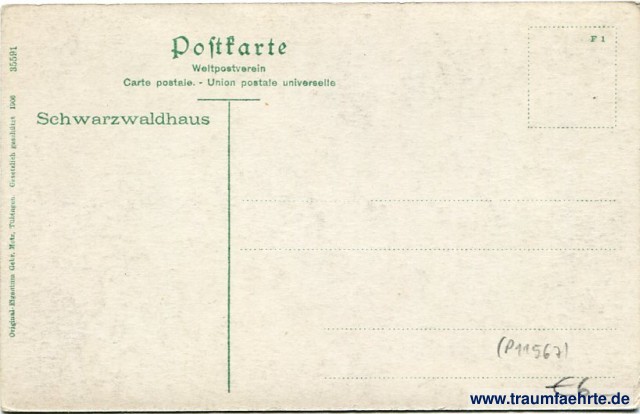 – Details – Jahr: 1906 Status: ungelaufen Beschriftung vorne: kein Text Beschriftung hinten: Postkarte, Weltpostverein, Carte postale – Union postale universelle, Schwarzwaldhaus, F 1, Original-Eigentum Gebr. Metz, Tübingen. Gesetzlich geschützt 1906 35591 Stempel: keine Hinweis: