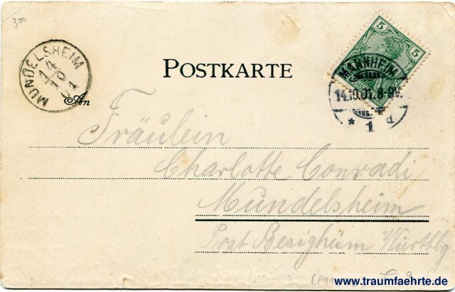 – Details – Jahr: ca. 1900 Status: gelaufen 1901 Beschriftung vorne: Mannheim, Rhein. Neckar. Zerstört durch Melacs Feuersbrunst, / Ein kurz Gedeihn durch Fürstengunst – / Heut sichert meiner Bürger Streben / Den Preis vor Allen mir im Land, / Und zweier Ströme reges Leben / Ist meiner Blüte dauernd Pfand. Dr. Schnellbach. Beschriftung hinten: Postkarte, An ... Stempel: Mannheim, * 1 d, 14.10.01.8-9V.; Mundelsheim, 14 10 01 Hinweis: