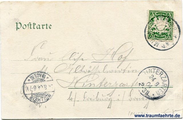– Details – Jahr: ca. 1900 Status: gelaufen 1904 Beschriftung vorne: München, Königsplatz. Kunstausstell. Geb. Propyläen. Glyptothek. Heliocolorkarte von Ottmar Zieher, München Beschriftung hinten: Postkarte Stempel: Muenchen 2.B.P., 23 Aug [04], V. 8 [...]; Hinterzarten, 24 8 04, 2-3N.; Mühlheim (Baden), 24.8.04.6-7V. Hinweis: