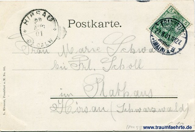 – Details – Jahr: ca. 1900 Status: gelaufen 1901 Beschriftung vorne: Frankfurt a. M. Eschenheimer Thurm. Beschriftung hinten: Postkarte. L. Klement, Frankfurt a. M. No. 581. Stempel: Frankfurt (Main), 9, I, -2.10.03.3-4N.; Hechingen, 1, a, 3.10.03.6-7V. Hinweis: