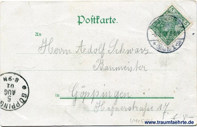 – Details – Year: ca. 1900 Postal state: postally used 1901 Inscription front: Ph M, Prov. Hessen-Nassau, Frankfurt a. M. Römerberg mit Römer Inscription back: Postkarte. An ... in ... Postmark(s): Frankfurt (Main) 1, pp, -5.8.01. 9-10V.; Göpping[en], 5 Aug 01 8-9N Please note: