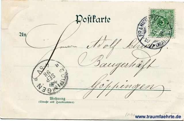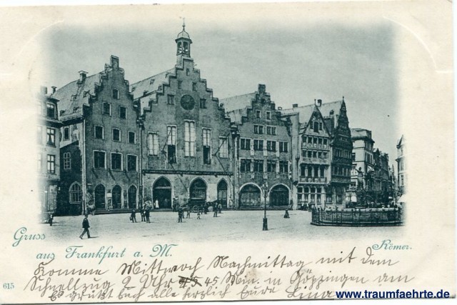 – Details – Jahr: ca. 1895 Status: gelaufen 1898 Beschriftung vorne: Gruss aus Frankfurt a. M. Römer. 615 Beschriftung hinten: Postkarte, An ... in ... Wohnung (Straße und Hausnummer) ... Stempel: Frankfurt (Main) 1 [...], 13.09.98- 8-9N.; Göppingen, 14 Sep 98 4-5V Hinweis: