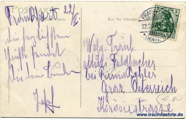 – Details – Jahr: ca. 1905 Status: gelaufen 1907 Beschriftung vorne: Frankfurt a. Main, Zeil. J. Grossmann Schöffer, ... Beschriftung hinten: Postkarte, Mitteilungen. Nur für die Adresse. Stempel: Frankfurt (Main) 9 r, 22.2.07 10-11 Hinweis:
