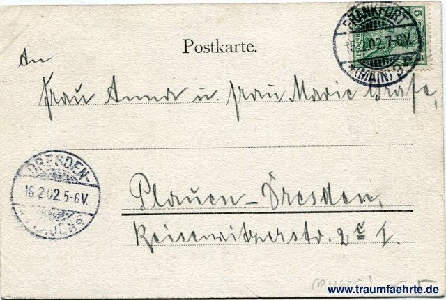 – Details – Year: ca. 1900 Postal state: postally used 1902 Inscription front: Frankfurt a. M. Palmengarten. J. V. Inscription back: Postkarte. Postmark(s): Frankfurt (Main) 9 r, 15.2.02.7-8V.; Dresden-[...]en, 16.2.02.5-6V. Please note: