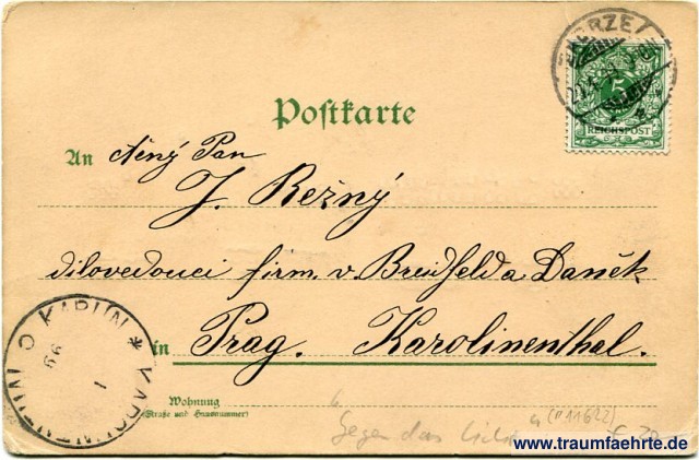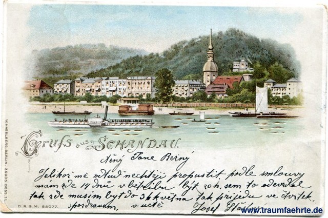 – Details – Year: ca. 1895 Postal state: postally used 1899 Inscription front: Gruss aus Schandau. D. R. G. M. 88077. W. Hagelberg, Berlin. 36905 Dess. 1L Inscription back: Postkarte, An ... in ... Wohnung (Straße und Hausnummer) ... Postmark(s): [...], 2[9].1.99 9-10N; Karín, Karolinenthal, [...] 99 Please note:
