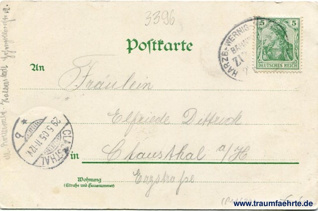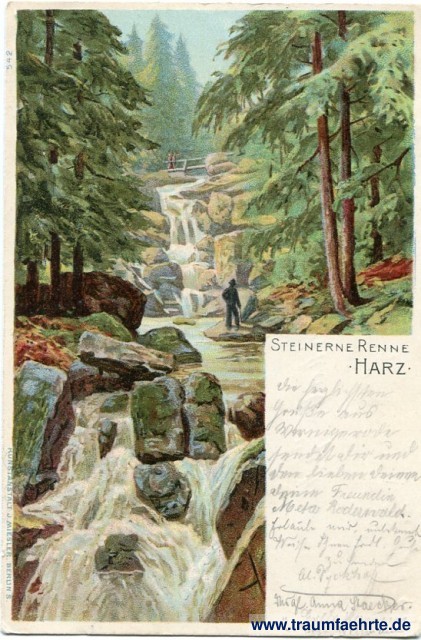 – Details – Jahr: ca. 1900 Status: gelaufen 1905 (Bahnpost) Beschriftung vorne: Steinerne Renne, Harz, Kunstanstalt J. Miesler, Berlin S. 542 Beschriftung hinten: Postkarte, An ... in ... Wohnung (Straße und Hausnummer) ... Stempel: Harzb.-Wernig.-[...], Bahnpost, Zug [...], 2[...]; Clausthal, [...] * b, 29.5.05.11-12V. Hinweis: