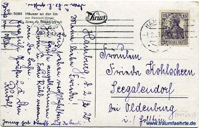 – Details – Jahr: ca. 1915 Status: gelaufen 1920 Beschriftung vorne: Rammelt-[Bürger] Beschriftung hinten: Sirius, Nr. 5084 Häuser an der Ilm von Rammelt-Bürger, Дома на Ильм[…] Stempel: 2x Hamburg, * 1 *, -3.2.20.10-11V; --- Hinweis: