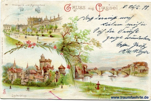– Details – Year: ca. 1895 Postal state: postally used 1898 Inscription front: Gruss aus Cassel. 39 Orangerie und Marmorbad, Löwenburg, Fuldabrücke mit Unter Neustadt, Verlag von Robert Bäcker, Cassel. AFS Inscription back: Postkarte, An ... in ... Wohnung (Straße und Hausnummer) ... Postmark(s): Cassel, * 2 d, 26.6.98.8-9N. Please note: