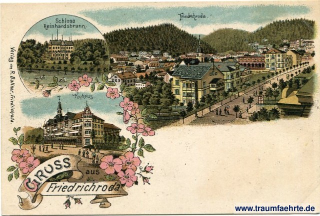 – Details – Year: ca. 1895 Postal state: postally unused Inscription front: Gruss aus Friedrichroda, Schloss Reinhardsbrunn. Friedrichroda. Kurhaus. Verlag von R. Ballner, Friedrichroda. Inscription back: Deutsche Reichspost, Postkarte, An ... in ... Postmark(s): none Please note:
