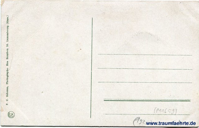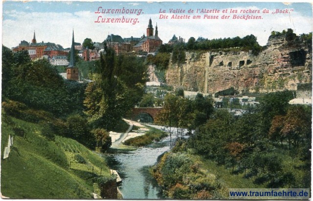 – Details – Jahr: ca. 1925 Status: ungelaufen Beschriftung vorne: Luxembourg. Luxemburg. La Vllée de l'Alzette et les rochers du Bock. Die Alzette am Fusse der Bockfelsen. Beschriftung hinten: Lux, P. C. Schoren, Photographe. Rue Bourbon 10, Luxembourg (Gare.) Stempel: keine Hinweis: