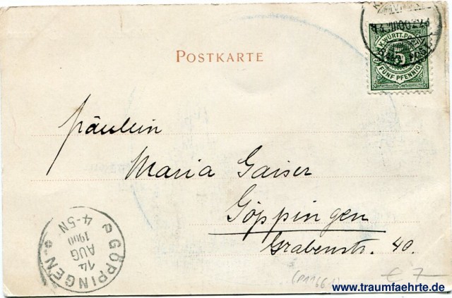 – Details – Year: ca. 1895 Postal state: postally used 1900 (rail mail) Inscription front: Friedrichshafen a. Bodensee, DTG, Verlag von Eduard Schwarz, Friedrichshafen. Inscription back: Poskarte Postmark(s): [...] Bahn Post, 14.10.XIII.00 [...]; Göppingen, 14 Aug 1900 4-5N Please note: