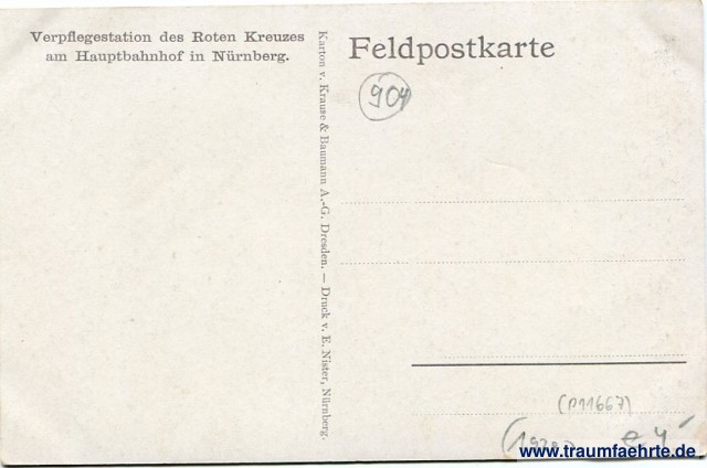 – Details – Jahr: ca. 1920 Status: ungelaufen Beschriftung vorne: Nürnberg – Kettensteg – Burg -, Glafey-Nachtlichte – Karte No 1 - Beschriftung hinten: Feldpostkarte, Verpflegestation des Roten Kreuzes am Hauptbahnhof in Nürnberg. Karton v. Krause & Baumann A.-G. Dresden. – Druck v. E. Nister, Nürnberg. Stempel: keine Hinweis: