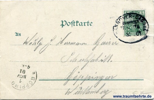 – Details – Year: ca. 1900 Postal state: postally used 1901 (rail mail) Inscription front: Hannover, Herrenhäuser Allee. Auto-Chrom, Louis Glaser, Leipzig. 8211 Inscription back: Postkarte, An ... Postmark(s): Hannover-Dassel, Bahnpost, [7 ... 6], 31.[11.]01; Göppingen, 1 Nov 01, 4-5[...] Please note: