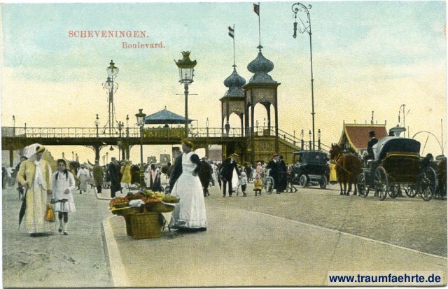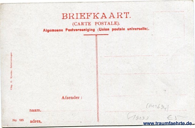 – Details – Jahr: ca. 1910 Status: ungelaufen Beschriftung vorne: Scheveningen. Boulevard. Beschriftung hinten: Briefkaart. (Carte postale). Algemeene Postvereeniging (Union postale universelle). No. 185. Afzender: naam ..., adres ..., Uitg. B. Sjonke, Scheveningen. Stempel: keine Hinweis: