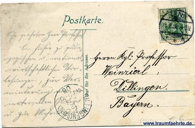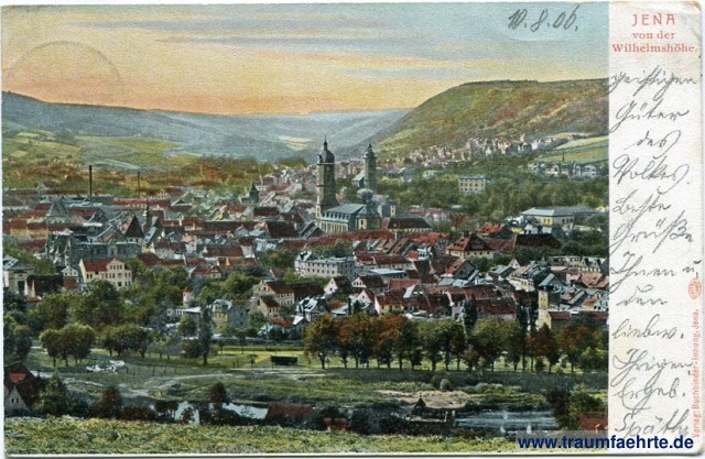 – Details – Jahr: ca. 1905 Status: gelaufen 1906 Beschriftung vorne: Jena von der Wilhelmshöhe, Verlag: Buchbinder-Innung, Jena. Auto-Chrom Beschriftung hinten: Postkarte. Nur für die Adresse. Stempel: Jena, * * h, 11.8.06. 4-5N.; Dillingen (Donau), 12 Aug 06, Vor 9-10 Hinweis:
