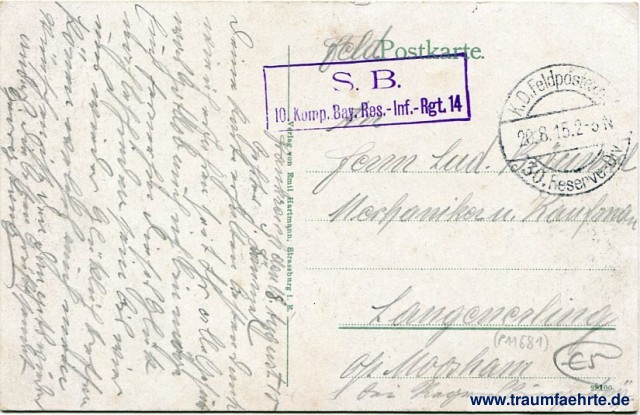 – Details – Jahr: ca. 1910 Status: gelaufen ohne Briefmarke (Feldpost), 1915 Beschriftung vorne: Münster i. Els. Beschriftung hinten: Postkarte. Stempel: K.D. Feldpostexped., 20.8.15.2-3N, 30. Reserve-Div; S.B. 10. Komp. Bay. Res.-Inf.-Rgt. 14 Hinweis: