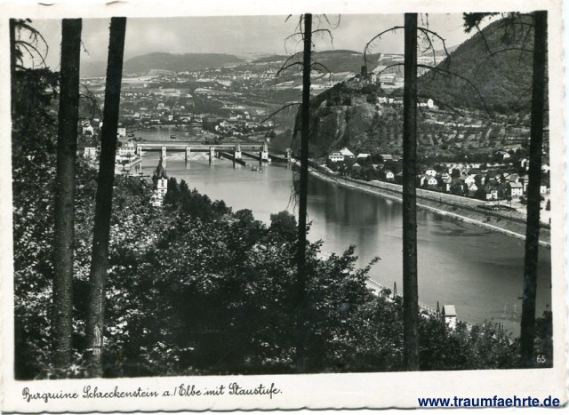 – Details – Year: ca. 1935 Postal state: postally unused Inscription front: Burgruine Schreckenstein a./ Elbe mit Staustufe Inscription back: Echte Photographie. Franz Jos. Stark, in Mariaschein 317, Sudetengau. Nachdruck verboten. Postmark(s): Burgwirtschaft Schreckenstein Please note: